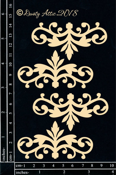 This chipboard set of flourishes from Dusty Attic includes 4 scrolls measuring 3 inches x 1.5 inches.