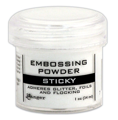 Add color, dimension and texture to paper craft, mixed media & hand lettering projects with Ranger Embossing Powder. Sticky Embossing Powder is perfect for adhering glitter, foil and flocking.