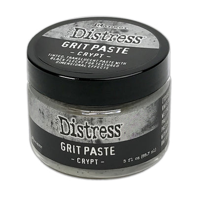 Tim Holtz Distress Halloween Grit Paste Crypt will add a touch of textured goodness to your Halloween creations this spooky season. This Grit Paste debuted last year and has returned in a large pot for this season. Crypt Grit Paste is a granite tinted, translucent medium with flecks of black designed to create textured effects on surfaces.