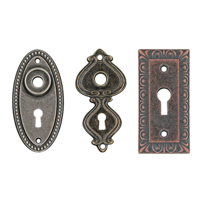 (3) keyholes. Antique finishes (1 nickel, 1 brass and 1 copper).