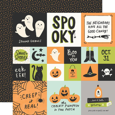 This 12x12 double-sided printed paper is perfect for scrapbooking, card making and other Halloween paper craft projects. Scrapbook paper is from the Spooky Nights collection by Simple Stories. This sheet features (6) 4x4 panels and (12) 2x2 panels that are perfect for pocket scrapbooking and planners too!
