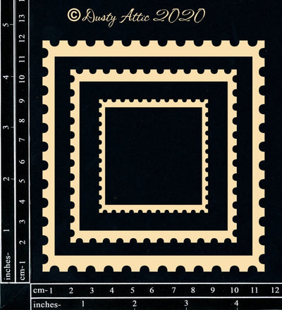 These 3 postage stamp chipboard frames from Dusty Attic range in size from approximately 2 inches to 4 inches.