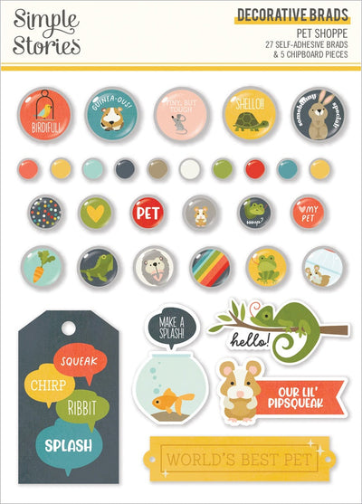 Add dimension to your pet themed projects with these decorative brads and chipboard pieces from Simple Stories. Pack contains 27 self adhesive brads and 5 chipboard pieces and is part of the Pet Shoppe collection.