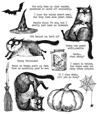 The Snarky Cat Halloween stamp set is designed by Tim Holtz for Stampers Anonymous. Mounted on cling foam, these red rubber stamps can be used with any acrylic block (sold separately). Great for using with Tim's signature distressing techniques! Stamps come on a 3-hole punched sheet for easy storage in the Tim Holtz Stamp Storage Binder (also sold separately).