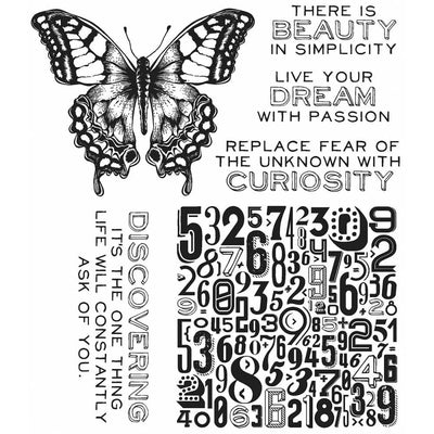 These cling mounted rubber stamps are designed by Tim Holtz for Stampers Anonymous. Featuring four quotes, a detailed butterfly and a number collage, these designs can be used for cards, art journaling, scrapbooking and many other papercraft projects.