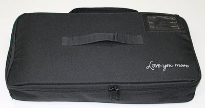 This sturdy, black canvas case is ideal for storing and transporting all of your essential scrapbooking and crafting tools. Elastic loops inside the lid hold a large number of pens and tools. Create custom-sized compartments with the two velcro inserts. Convenient carry handles are located on the side for looping over trolley handles and on the lid for carrying by hand.